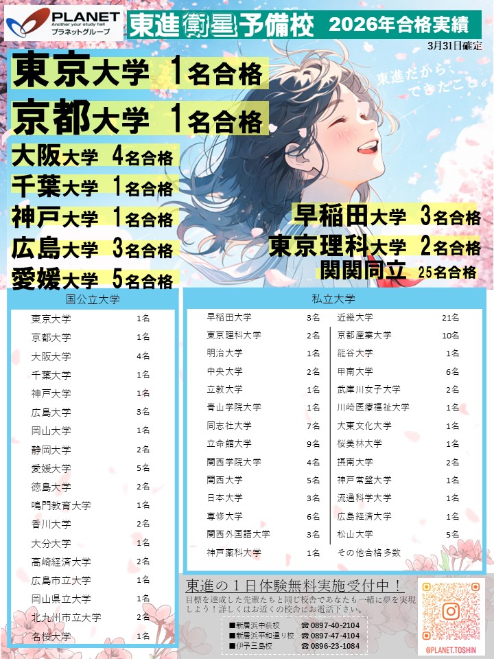 合格実績 2026 4/01 おしらせ 2026年 合格実績 目標を達成した先輩たちと同じ校舎であなたも一緒に夢を実現させませんか? 2025年 合格実績 目標を達成した先輩たちと同じ校舎であなたも一緒に夢を実現させませんか? 2024年 合格実績 大学入試の合格体験記を見る 高校入試の合格体験記を見る おしらせ URL Copied!